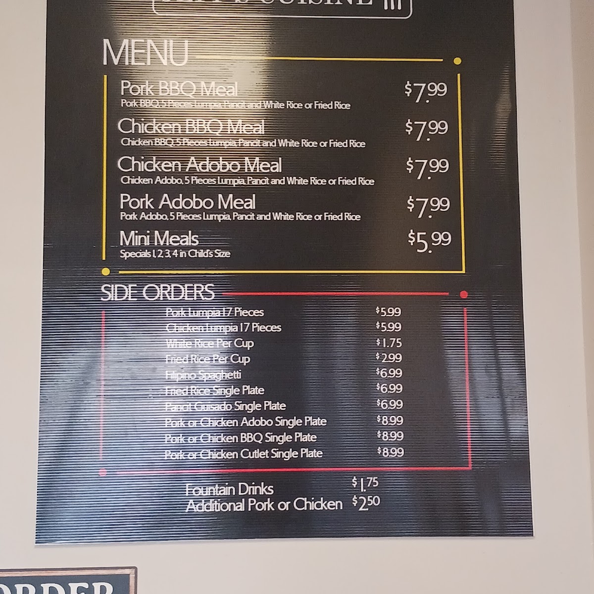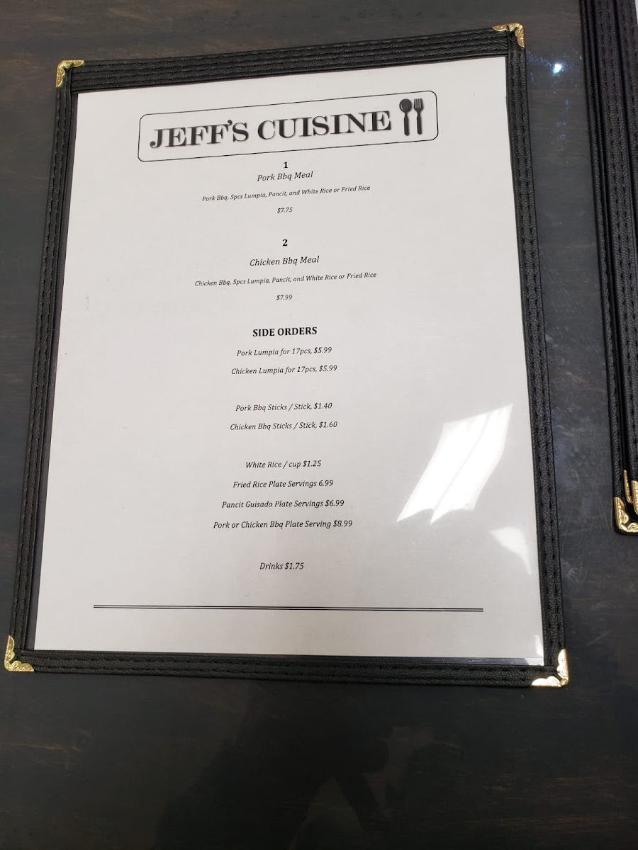 Jeff's Cuisine offers a straightforward and approachable menu centered on classic Filipino flavors. The selection is concise but thoughtfully crafted, making it easy to find satisfying meals that feel like a comforting, home-cooked experience. Whether you're stopping by for a casual lunch or a relaxed dinner, the dishes here provide familiar warmth paired with generous portions.